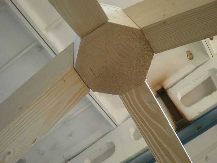 Теперь стропильную систему четырехскатной шатровой крыши можно начать собирать. Больше всего вопросов возникает насчет места соединения стропильных ног в центре. Оптимальный способ — надежный и не слишком сложный — взять кусок бруса подходящего сечения, сделать из него восьмиугольник — для стыковки восьми стропильных ног (четыре угловых и четыре центральных).