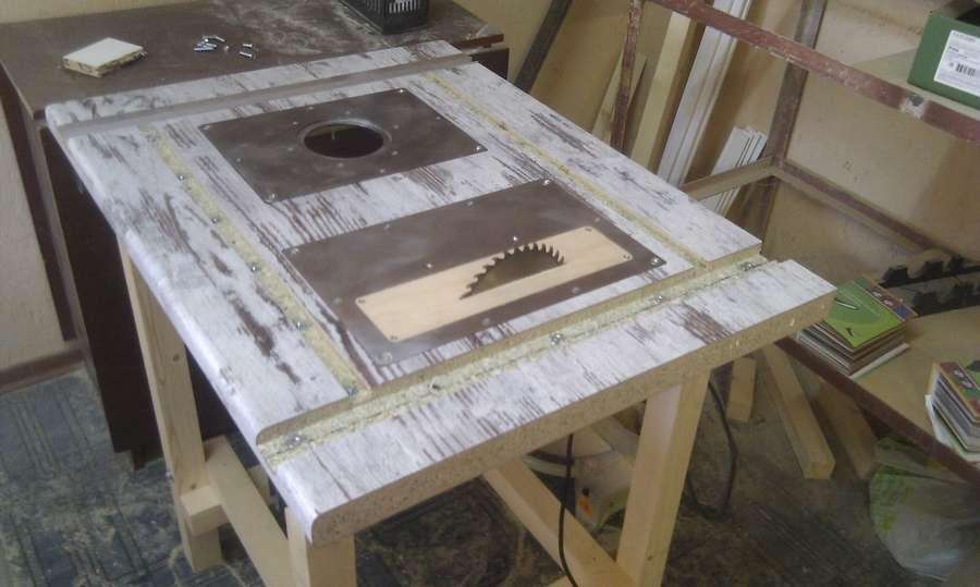- Столешница изготавливается из лакированной или ламинированной фанеры. В центре столешницы выполняется пропил, в который будет входить режущий диск.