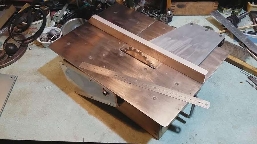 В другом варианте рабочая плоскость станка изготавливается из двух металлических пластин. Они крепятся к раме болтами с оставлением зазора под диск. Отверстия под болты зенкуются сверху для заглубления головок. Планка для контроля размера распиливаемого материала может крепиться струбцинами.