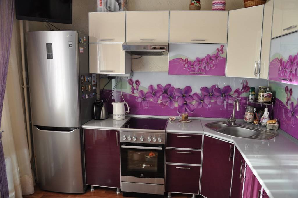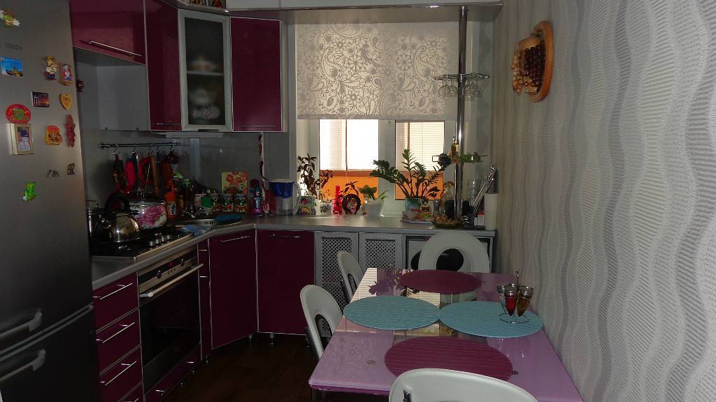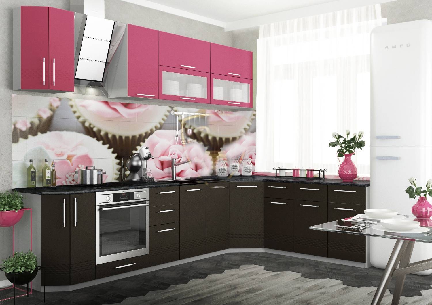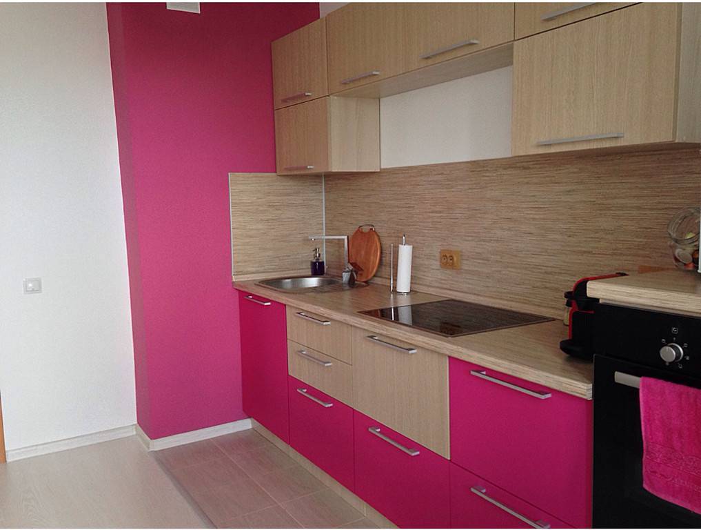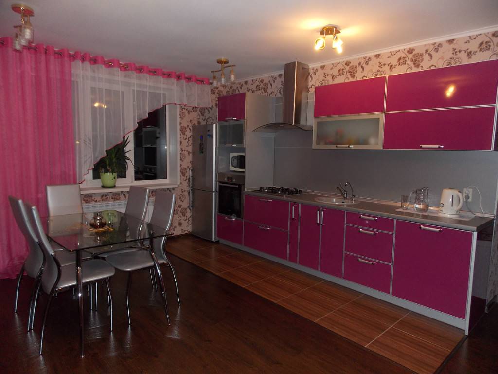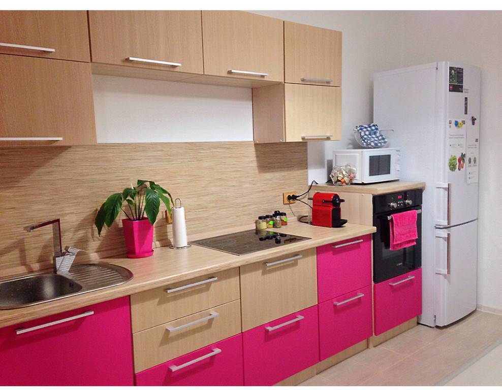 Фуксия – цвет для тех, кто открыт для всего нового. Яркий кухонный гарнитур – нестандартное, но вполне реализуемое решение. Хорошо будет смотреться в просторных кухнях с нейтральной или металлической отделкой.