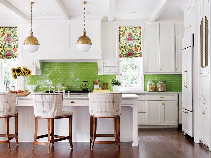 Когда хочется выполнить светлую кухню, то нужно выбрать основной цвет и использовать его при оформлении масштабных поверхностей ‒ стен и пола. Второй по значимости цвет применяется для окрашивания фасадов кухонного гарнитура и обеденной группы, а наиболее яркий оттенок употребляется для выделения некрупных деталей, таких как ковер, фартук или столешница.