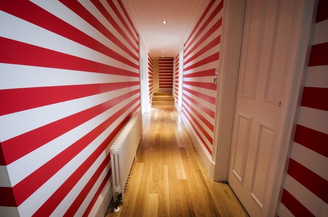 Однако не всегда горизонтальные линии способны расширить помещение. Если две противоположные стены оформить полосами одинакового размера контрастных цветов, то пространство сузится, как в коридоре офиса с красными полосками.