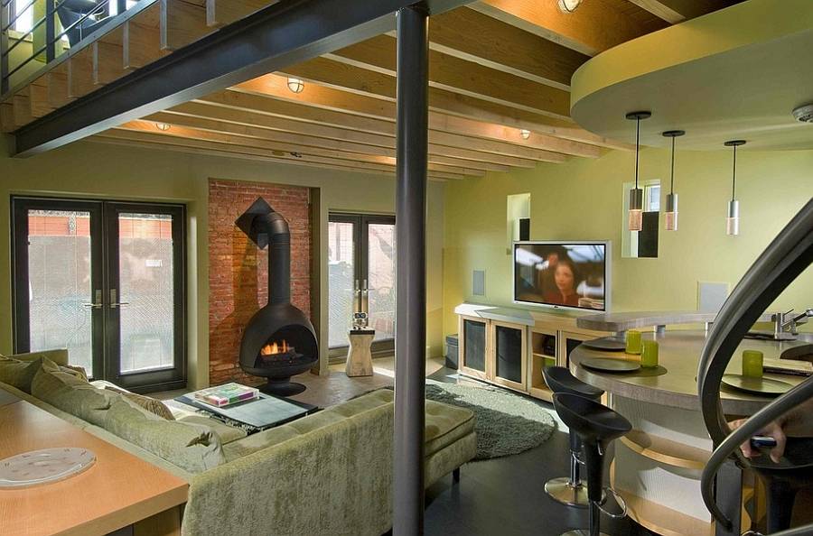 Телевизор обычно размещают на стене, окруженной деревянными полками. Дизайнеры рекомендуют использовать в небольших помещениях преимущественно натуральные материалы — дерево, натуральные ткани и коврики. Стены покрыты бумажными обоями, которые можно заменить в любое время. Чаще, однако, они качественно оштукатуривают и наносят краску на водной основе.