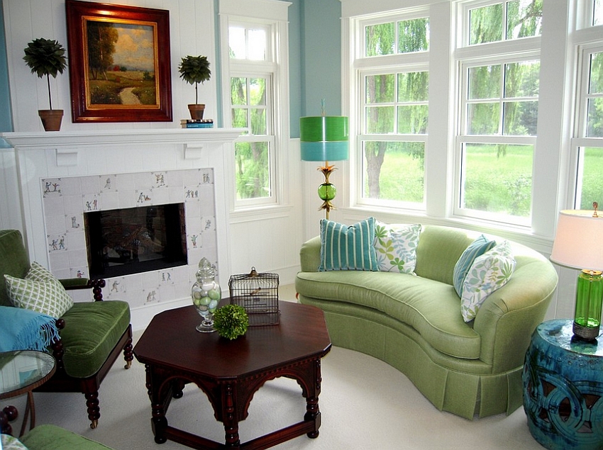 Уютное сочетание сине-зеленого в небольшой гостиной