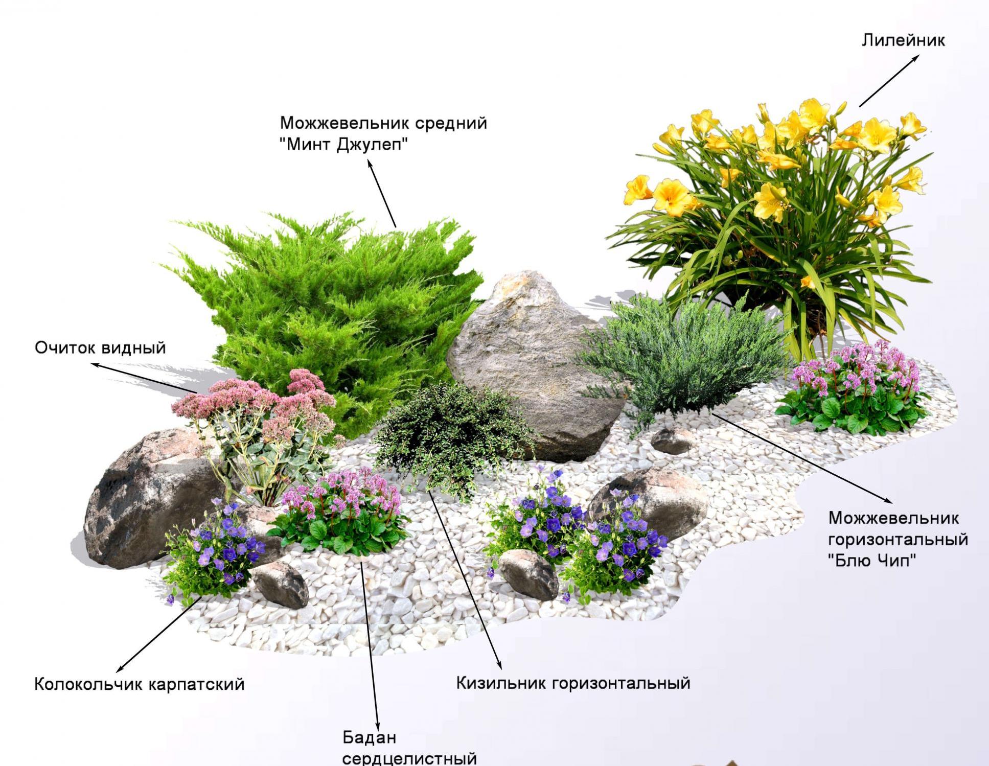 Важно подобрать растения, цветущие в разное время, также рекомендуется дополнить композицию декоративно-лиственными многолетниками, сохраняющими эффектный вид весь сезон