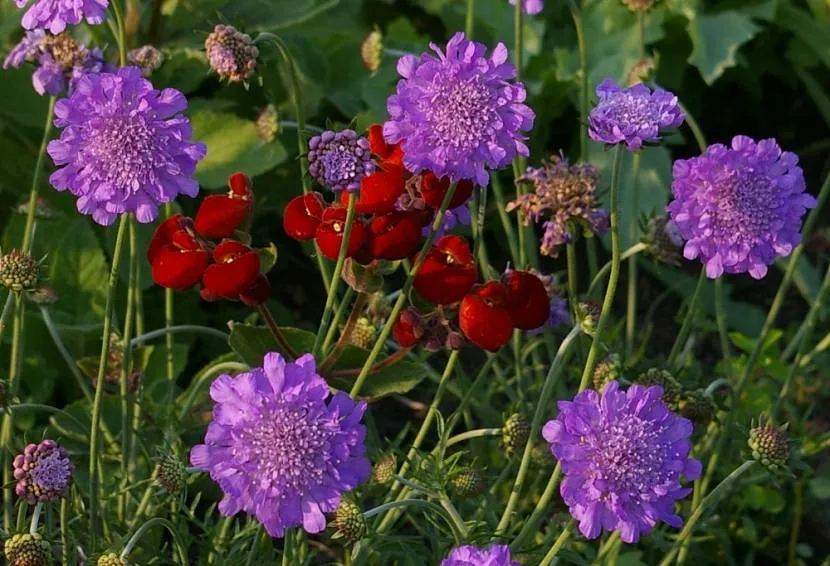 Красиво сочетание темно-красного и фиолетового цветов. Для этого фиолетовую скабиозу сажают рядом с люпином или пионами красного цвета. Все оставшееся пространство засаживают декоративными травами.