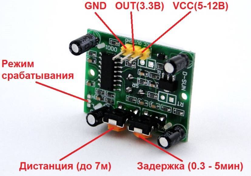 Для примера можно использовать алгоритм действий при выборе типового пироэлектрического модуля HC-SR501. Первым переменным резистором настраивают чувствительность. Кроме дистанции (до 7 м), этим параметром можно ограничить размер детектируемых объектов. Вторым регулятором устанавливают необходимое время для задержки управляющего выходного импульса. Положением перемычки устанавливают режим: