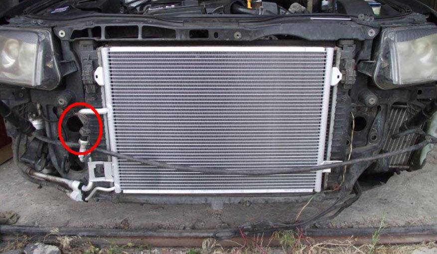 На следующем этапе диагностики кондиционера мы будем искать под капотом радиатор кондиционера с трубкой и шлангом. Месторасположение радиатора — прямо перед радиатором, охлаждающим непосредственно силовой агрегат автомобиля. Несмотря на внешнее сходство, кондиционерный радиатор изготавливается из алюминия или меди.