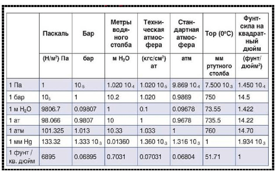 | Паскаль (Pa, Па) | Бар (bar, бар) | Техническая атмосфера (at, ат) | Миллиметр ртутного столба (мм рт. ст., mm Hg, Torr, торр) | Метр водяного столба (м вод. ст., m H2O) | Фунт-сила на кв. дюйм (psi) | |