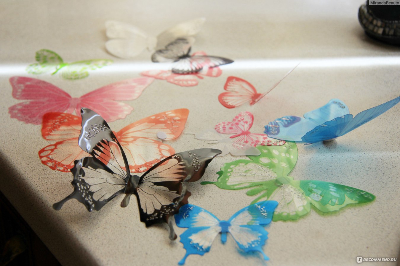 Для других поверхностей используется двухсторонний скотч. Материал: тонкий гибкий пластик, бабочки не рвутся, не ломаются, не боятся влаги, имеют яркий окрас! Крылышки можно выгибать в нужном направлении. В некоторых случаях они могут светиться в темноте.