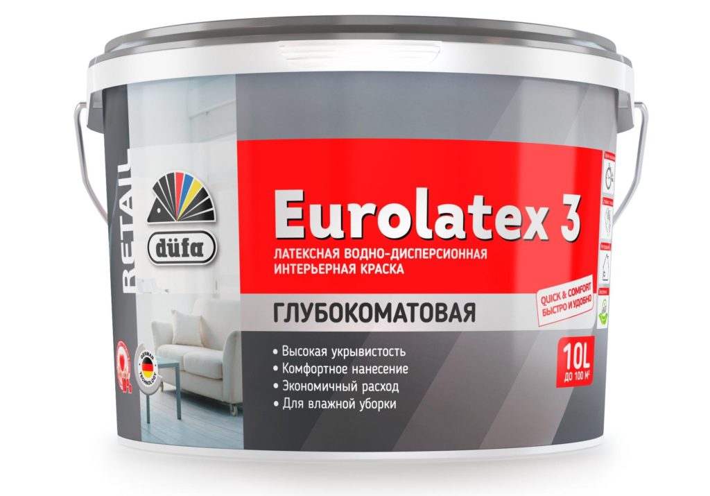 Латексная краска DUFA RETAIL EUROLATEX 3 подходит для внутренней отделки всех видов стен, но только помещений с умеренной влажностью. Также подходит для окраски бумажных и виниловых обоев. После высыхания покрытие становится матовым и прекрасно скрывает все мелкие недочеты. Для полного высыхания составу потребуется три дня. Продукт производится в России.