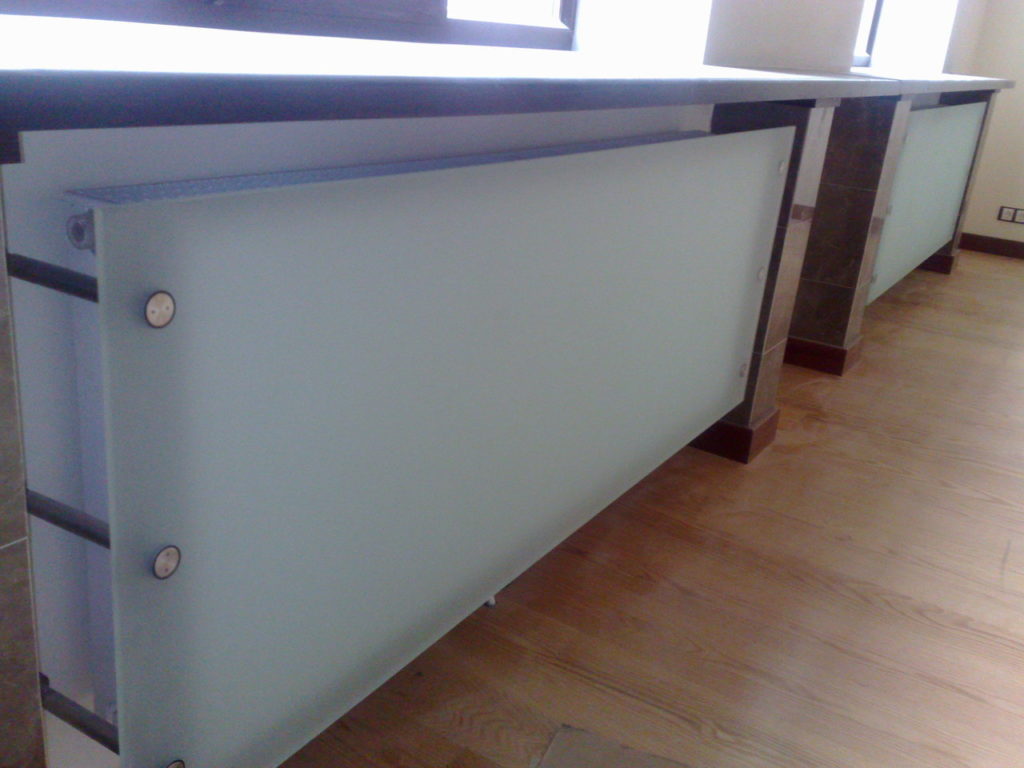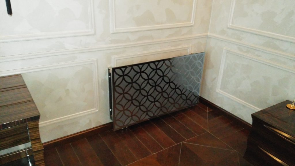 С помощью стеклянных экранов неприглядные батареи защищаются от визуального обозрения. Для их изготовления применяется закаленное стекло толщиной от 8 мм: разбить его почти нереально. Чтобы кромки изделия были прочными и безопасными, их поддают дополнительной полировке. Стеклянная поверхность покрывается специальным защитным веществом, дающим возможность ухаживать за ней в процессе эксплуатации с помощью обычных моющих средств.