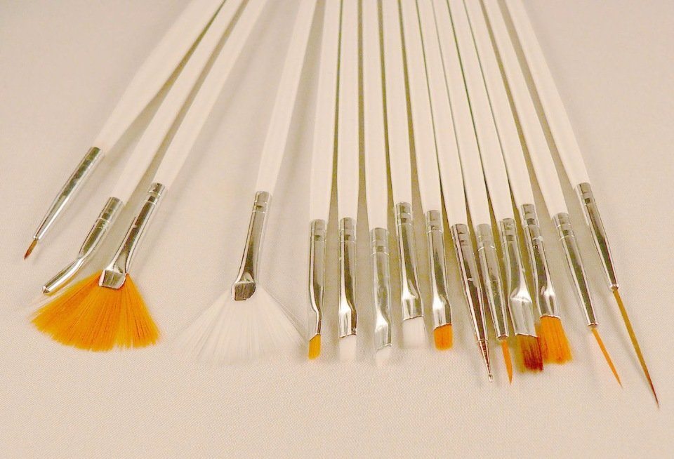 | Потребуются плоские мягкие кисти. Ворс в них должен быть плотно зафиксирован. «Потерявшаяся» ворсинка может стать серьёзной проблемой. Лучше иметь несколько кисточек разной ширины для разглаживания и нанесения клея и лака. | |