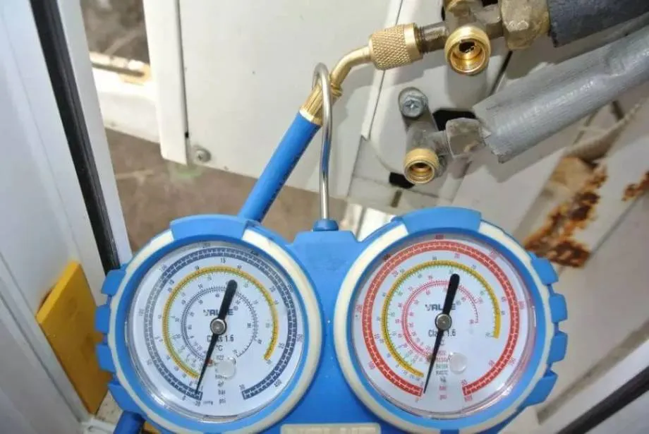 Отличие заключается в том, что после откручивания заглушек к кранам подсоединяют манометры. Подключение необходимо проводить крайне аккуратно (в перчатках), так как будет выходить хладагент под давлением. После подключения на манометре будет фиксироваться рабочее давление системы.
