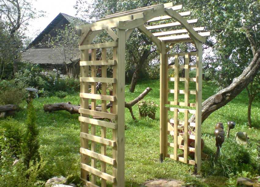 Если арка нужна для выращивания винограда, можно сделать конструкцию с плоским перекрытием. Таким образом при сборе урожая хозяевам не придется забираться чересчур высоко. Подобные сооружения также называют перголами. Их первичное предназначение — защита переходов от палящего солнца.