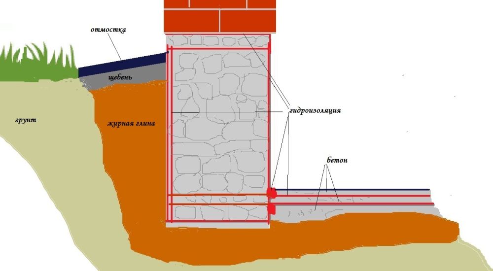 - при выполнении гидроизоляции и утепления фундамента материал поднимается до уровня отмостки;