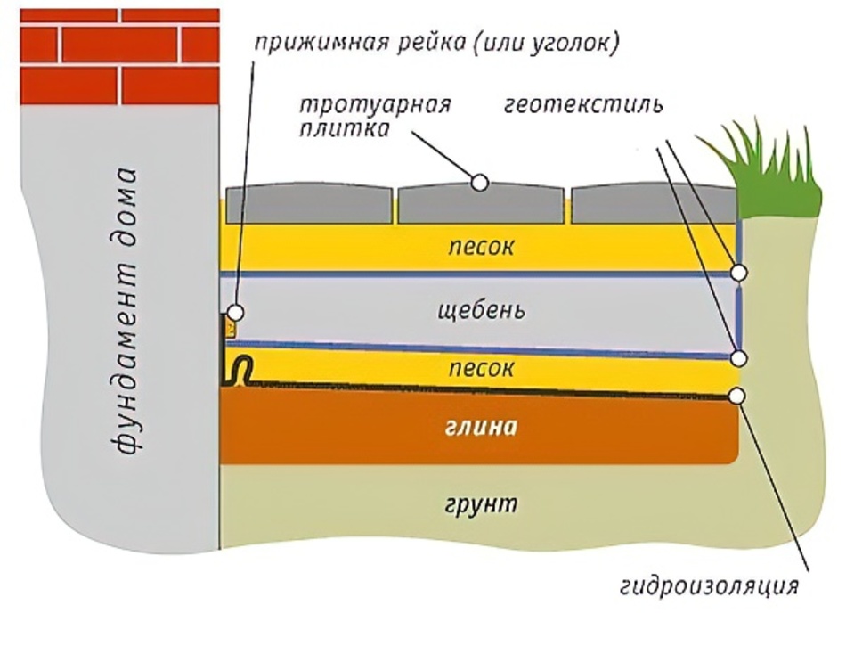 - между защитным покрытием и фундаментом должен быть компенсационный шов 1-2 см (проложить рубероид в два слоя, пенопласт или ЭППС, засыпать песком, заполнить герметиком);