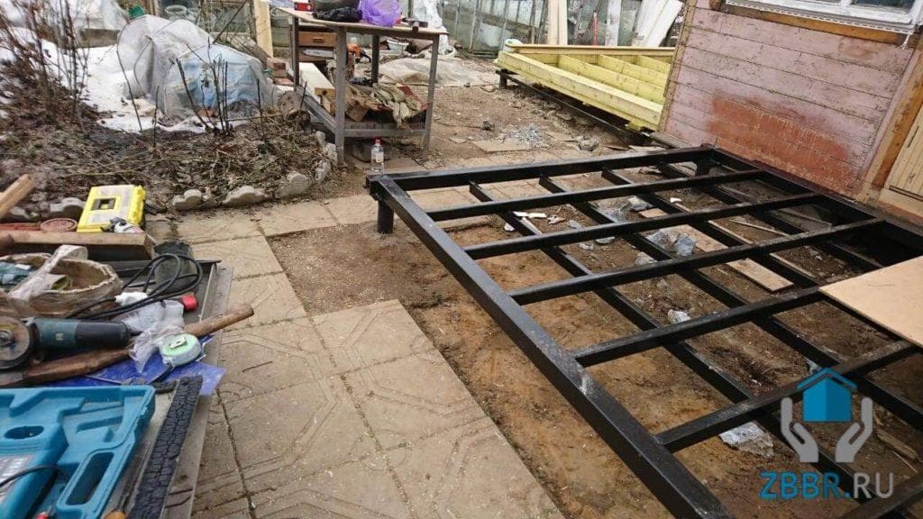 Далее между столбами устанавливаются поперечные перила, они также крепятся на металлические уголки. В дальнейшем эти перила послужат основой для обшивки ОСП и сайдингом.