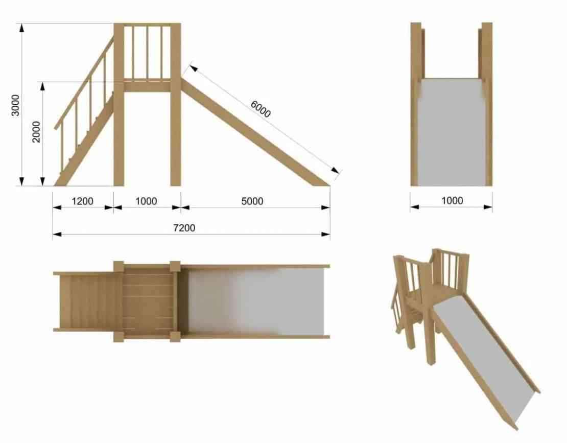 Работу нужно начинать с составления чертежа конструкции. Обязательно определитесь, будет ли горка с домиком или это будет классический вариант. Нарисуйте её схему с указанием всех размеров. Это позволит подсчитать количество материала. Норма: