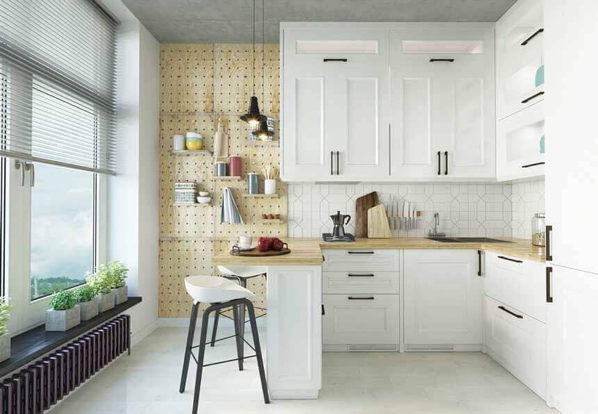 Белоснежные стены создадут ощущение чистоты и добавят в помещение воздуха и света, что немаловажно. Чаще всего в качестве отделки используют штукатурку, кроме области готовки – здесь скандинавский стиль фартука достигается покраской, необработанным кирпичом или плиткой