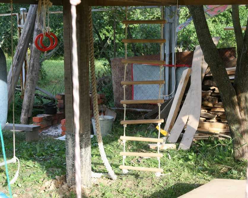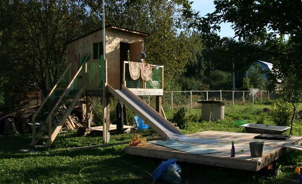 Следует учесть, что такое сооружение небезопасно, поэтому подходит для детей уже школьного возраста. Вместо крыши можно повесить тент-шатер или сделать ее в виде шалаша.