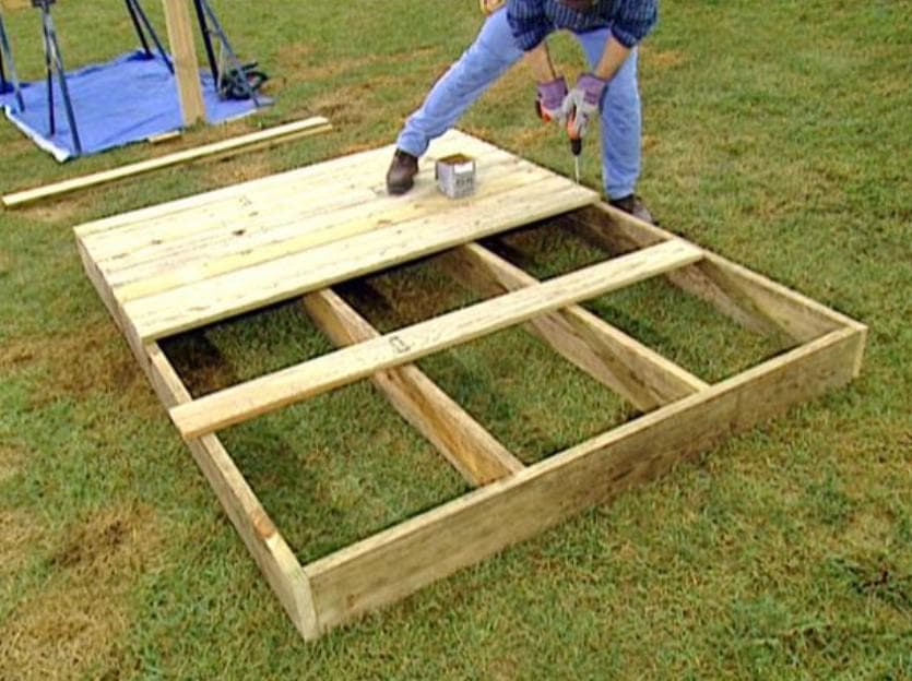 Утрамбуйте верхний слой почвы и сделайте каркас из брусьев для настила. Затем из дощатых панелей сформируйте пол.