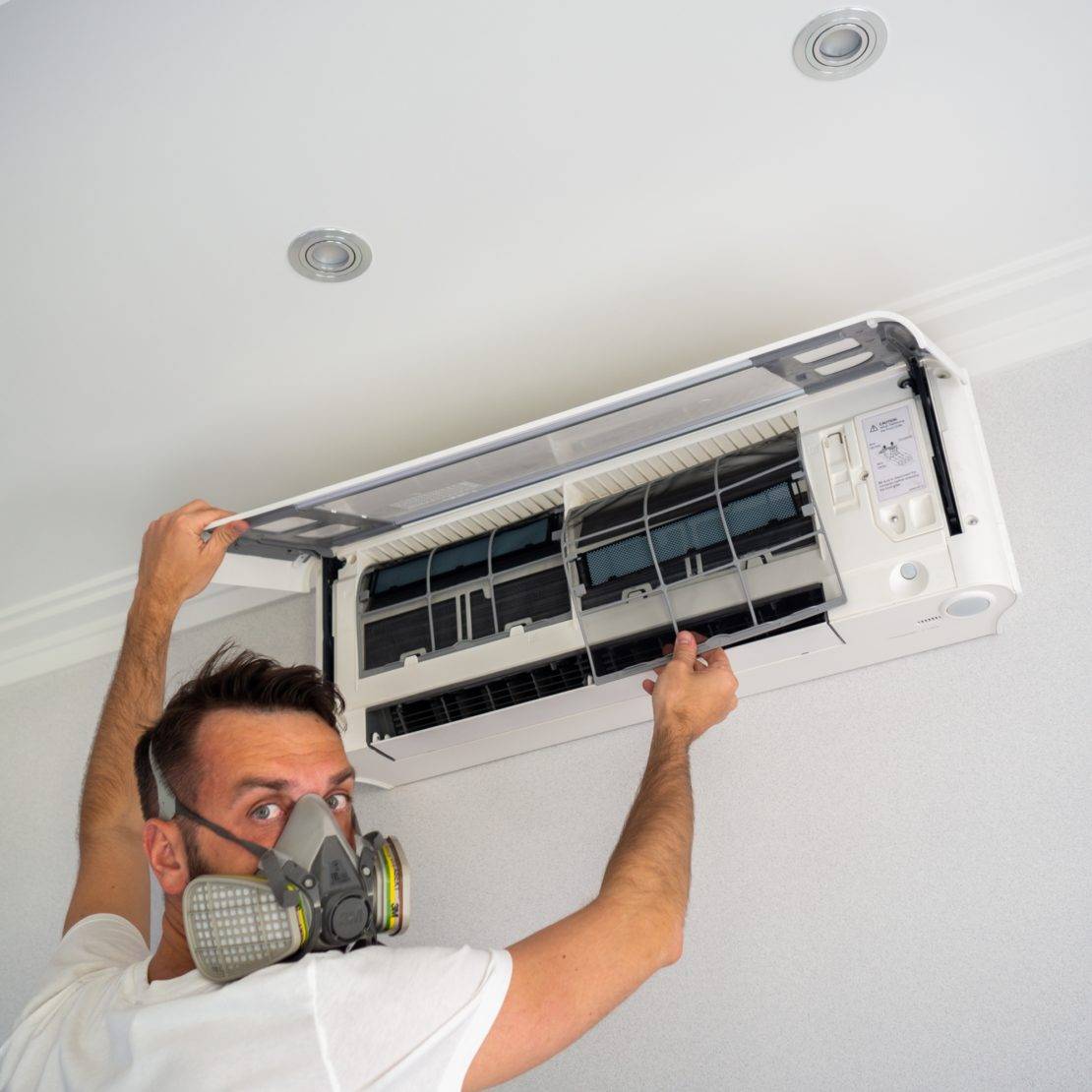 Перед тем как приступать к выполнению профилактических работ, необходимо защитить руки и дыхательные пути, так как не нужно забывать, что в корпусе кондиционера находится рассадник вирусов и опасных бактерий, попавших туда вместе с пылью из воздуха. Они легко могут попасть в организм, что грозит серьезными заболеваниями, даже для обладающего отличным иммунитетом человека.