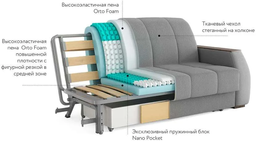 Эта система гарантирует, что матрас соответствует форме вашего тела и равномерно распределяет нагрузку. Если вы не планируете часто спать на диване, вам не нужно беспокоиться о наполнителе.