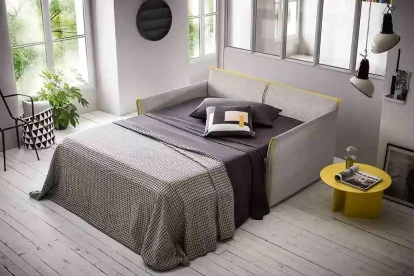 Простой диван с классическими закругленными подлокотниками и глубоким сиденьем превращается ночью в альтернативу двуспальной кровати. Эта модель, считающаяся анатомической, поддерживает оптимальное положение тела во время сна.
