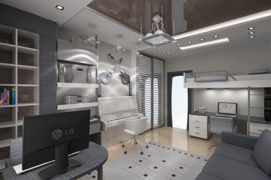 Обычно в подростковом возрасте у парней уже есть свои пожелания по отделке и дизайну. Родителям стоит обязательно к ним прислушаться. В этот период комната полностью освобождается от игрушек и заполняется предметами, связанными с увлечениями молодого человека. Например, музыкальными инструментами или компьютерной техникой.