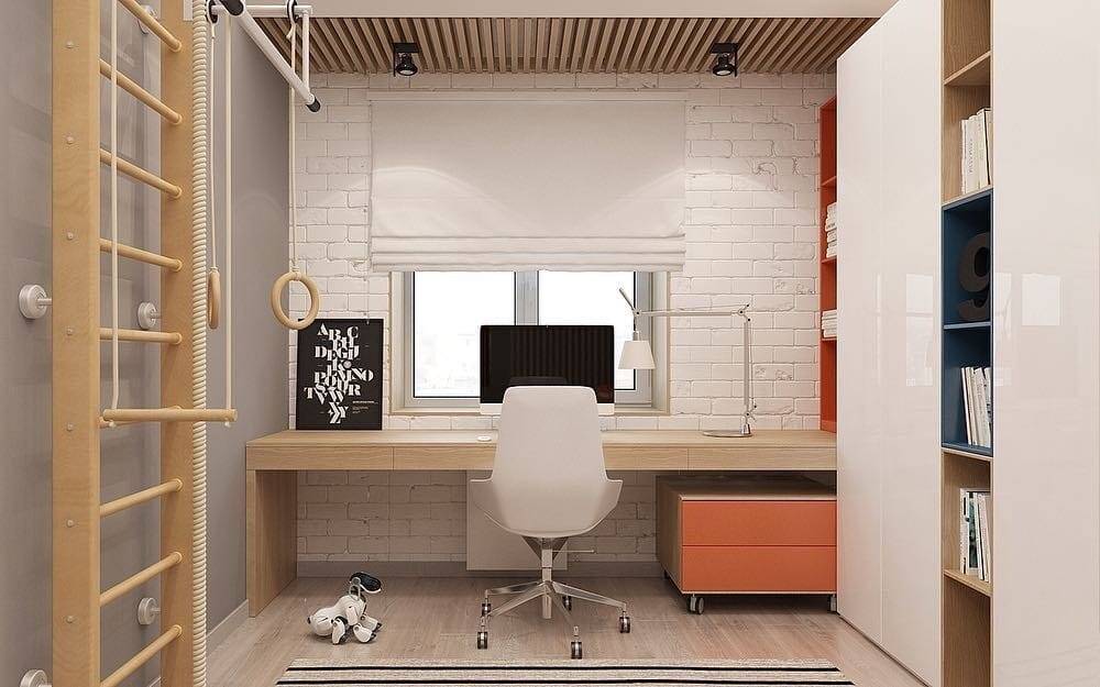 Поскольку мальчик для которого создавался интерьер моложе 10 лет, то спортивный уголок реализован шведской стенкой. Но для повзрослевших подростков вместо нее можно использовать стенку с турником и брусьями.