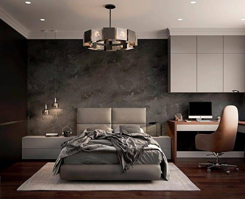Интерьер этой комнаты сразу привлекает внимание своей необычной, но эффектной цветовой гаммой. В качестве основного оттенка дизайнеры выбрали насыщенный серо-коричневый тон, который в зависимости от освещения может выглядеть и золотисто-коричневым, и почти чёрным