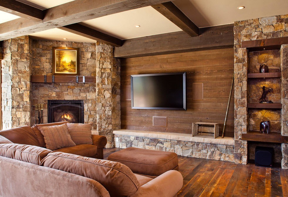 В кантри и деревенский стили безупречно вольются камины из камня — натурального или искусственного. Можно не ограничиваться обрамлением, а выложить полностью всю стену, создать арку или небольшую полку.