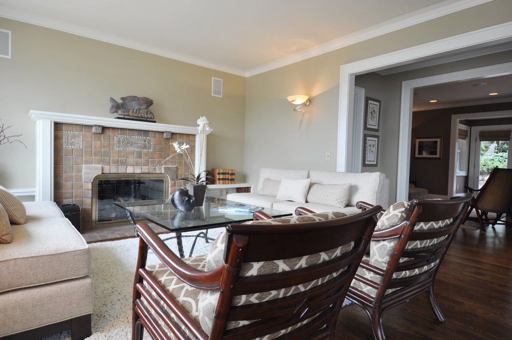 На фото зал в стиле прованс с угловым камином, облицованным изразцами.