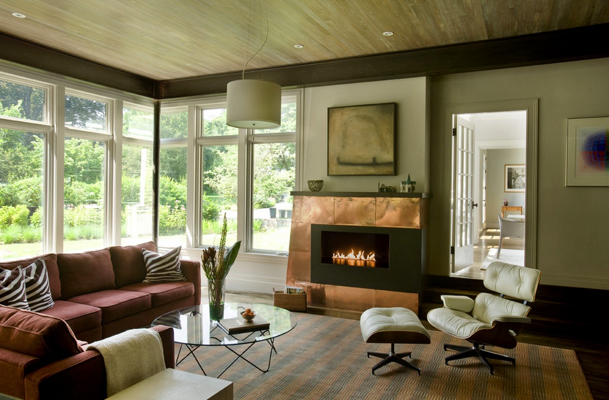 В большом помещении гостиной стиль выбранного источника тепла может быть любым, как и сам дизайн помещения.