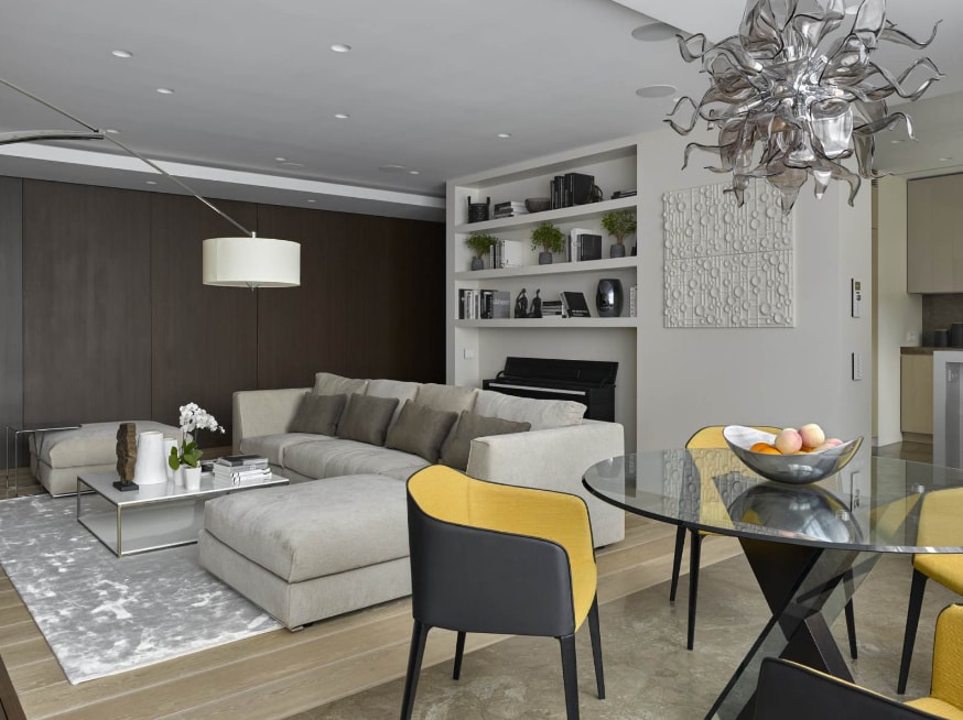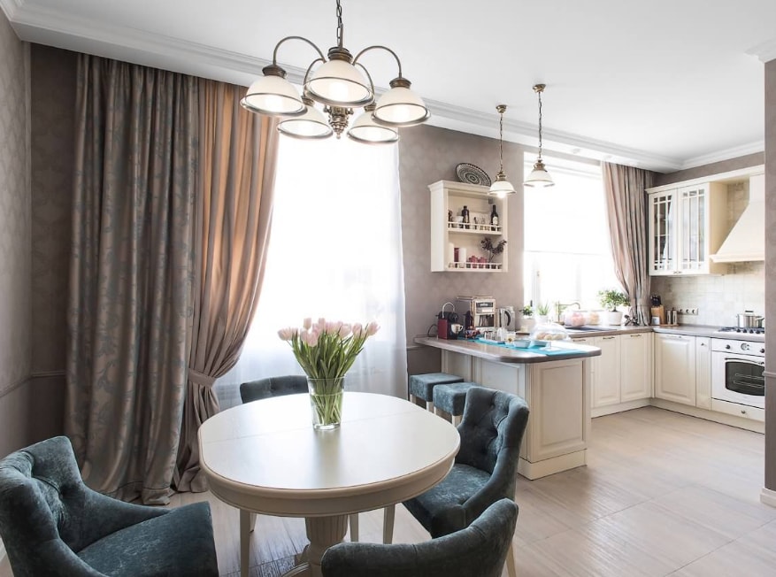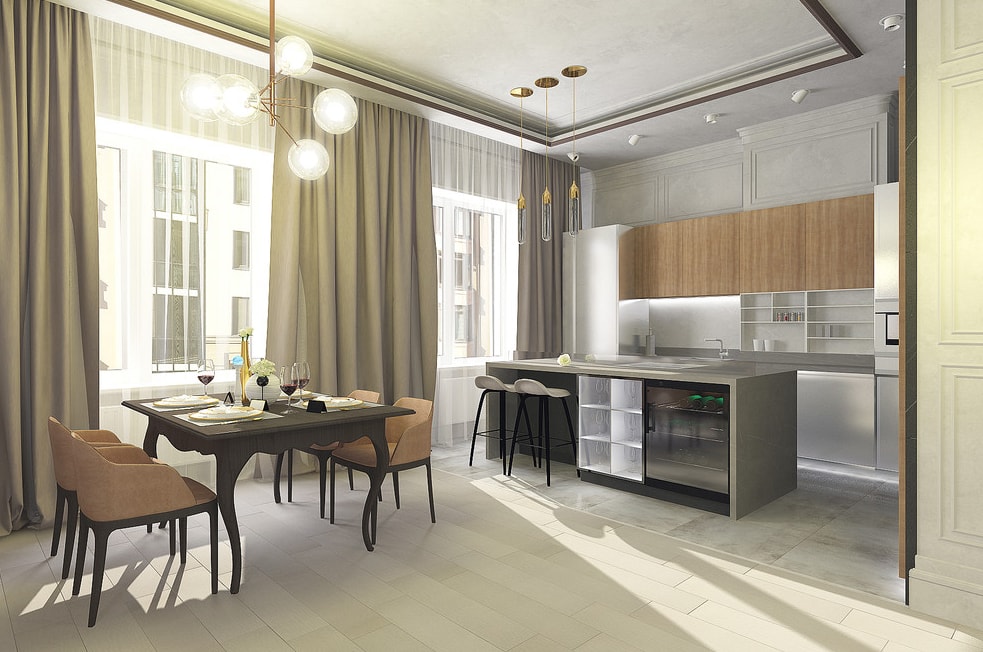 Совмещаем кухню, столовую и гостиную правильно. Стиль: современная классика