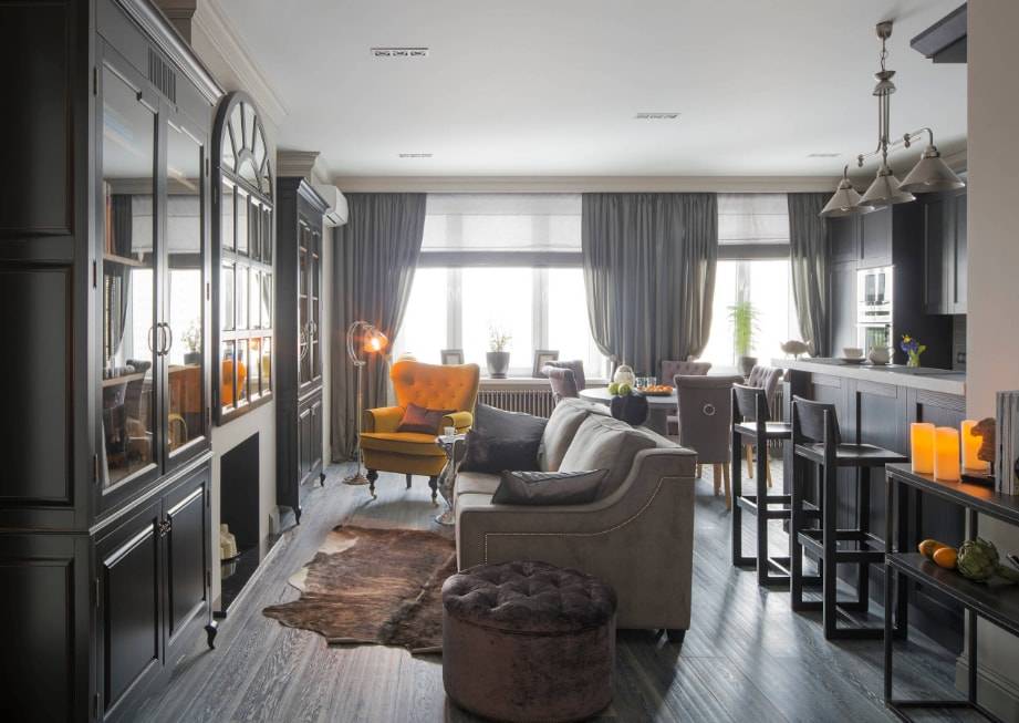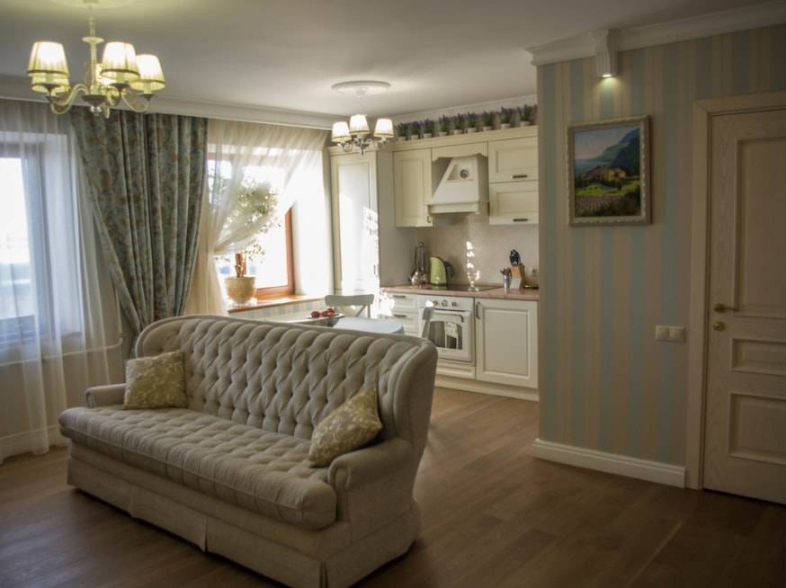 Попробуйте сделать ремонт в стиле современной классики. Вы сможете использовать сочетание коричнево-белой гаммы и выбрать для обстановки удобную, качественную мебель. Чтобы визуально объединить площадь, постелите на пол темный ламинат. А для того, чтобы обозначить границы зон, покрасьте стены в гостиной комнате в бежевый цвет, а на кухне – в белый.