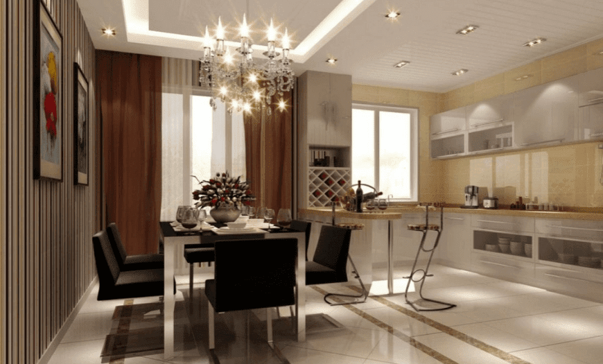 Таким образом можно даже зрительно увеличить пространство. Также очень часто чтобы дополнить такой интерьер, используют освещение над обеденным столом.