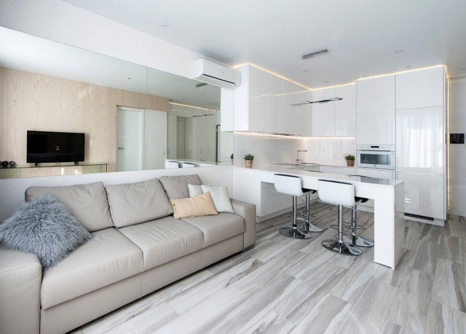Гостиная-кухня будет выглядеть в едином стиле, если напольное покрытие для всей площади выбрано одинаковое, все стены выкрашены в белый или бежевый цвет.