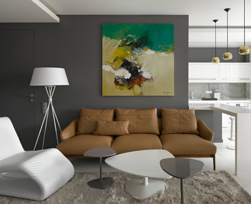 Это может быть кислотных цветов огромный мягкий уголок в гостиной, яркая картина или современная инсталляция. Присутствие яркого акцента «спрячет» и кухню, и что угодно.