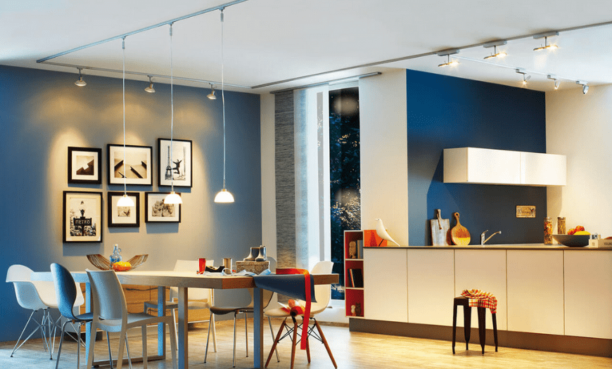 Есть правило: в просторном помещении требуется высокий уровень освещения. Можно использовать свое индивидуальное освещение в каждой зоне, а в небольшом помещении с низким потолком нужно установить минимум потолочных светильников — предпочтительнее многоуровневое освещение.