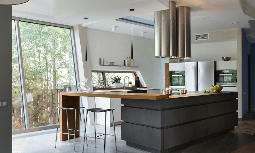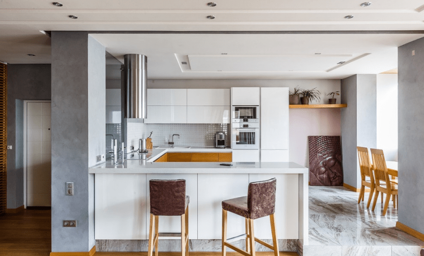 Еще один вариант убрать акцент с кухни – это сделать её островной или полуостровной.