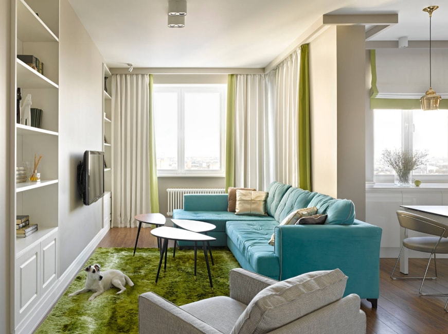 Другой вариант – выбрать 2-3 основных цвета и повторить их по всему пространству гостиной-кухни или квартиры-студии. Такие решения будут сглаживать резкий переход между зонами в пространстве.