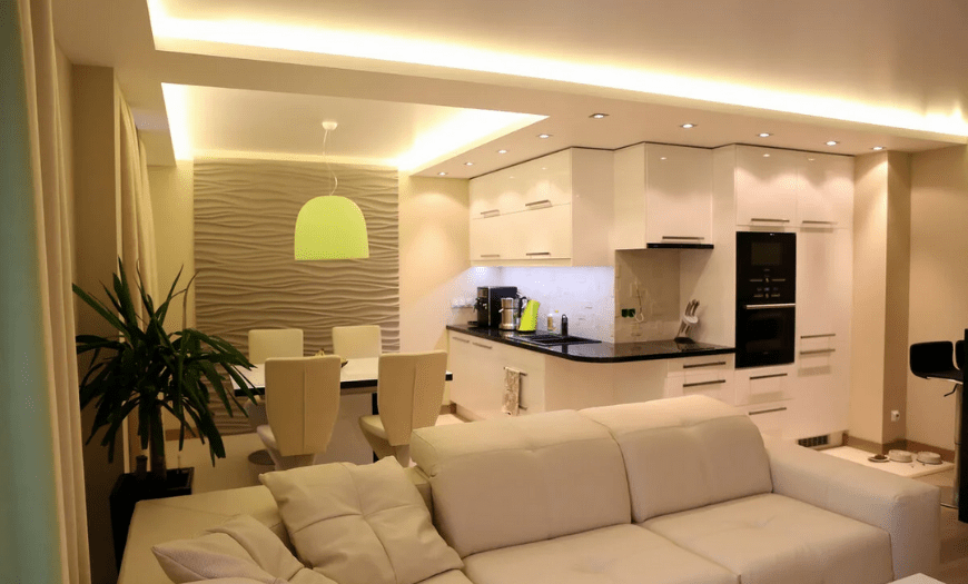 - Раздельный основной верхний свет в зоне кухне и гостиной.