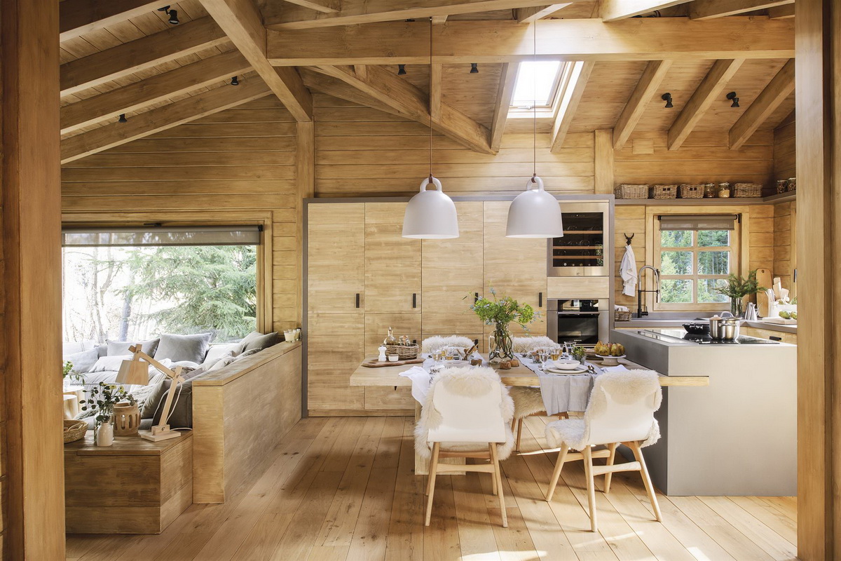 Планировка загородного домика и городской квартиры заметно отличаются. Но обычно кухня и гостиная в них располагаются недалеко друг от друга. Так почему бы их не объединить? Получится пространство в едином стиле с различной функциональностью.