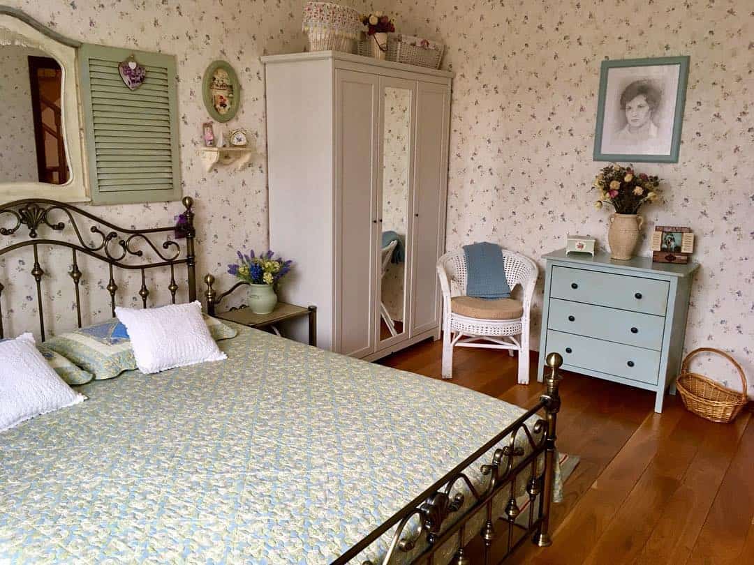 Стиль прованс – отличный выбор для спальни на даче. Тут можно использовать самые простые приемы. Для оформления подойдет текстиль с грубой текстурой, мебель из необработанного дерева, обладающая сколами и потертостями.