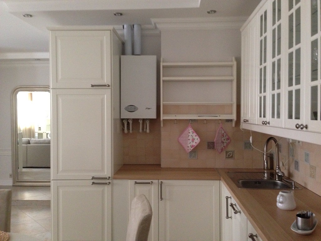 - Если вы обустраиваете кухню с нуля, то о расположении газовой колонки, планировке и дизайне интерьера желательно подумать еще до ремонта и покупки мебели. Тогда у вас останется больше возможностей для маневра и меньше проблем. Например, вы можете перенести колонку, поменять ее на более современную или подходящую к будущей обстановке модель, попутно улучшить вентиляцию и дымоход, подстроить цветовую гамму интерьера под колонку и пр.