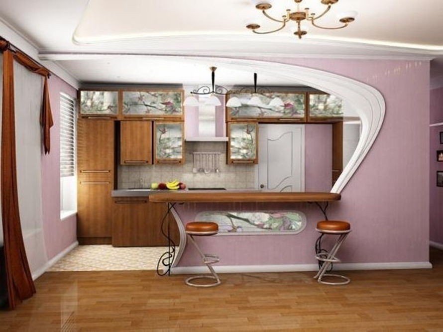 - желательно размещать кухонную зону в нишах и возводить невысокую стационарную перегородку или барную стойку. На перегородку, со стороны гостиной, можно навесить телевизор, а поверхность, выходящую на кухню, облицевать стеклом.