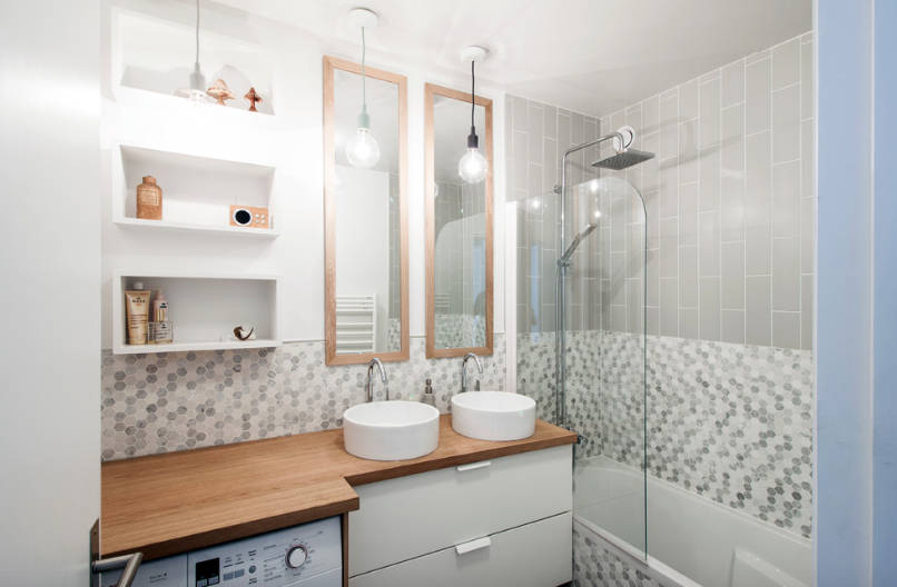 Над умывальником можно организовать утопленную в стене нишу, где будут сберегаться гигиенические и косметические принадлежности. Закрой ее зеркальной дверцей и получишь полезную систему хранения, которая не будет нагромождать пространство.