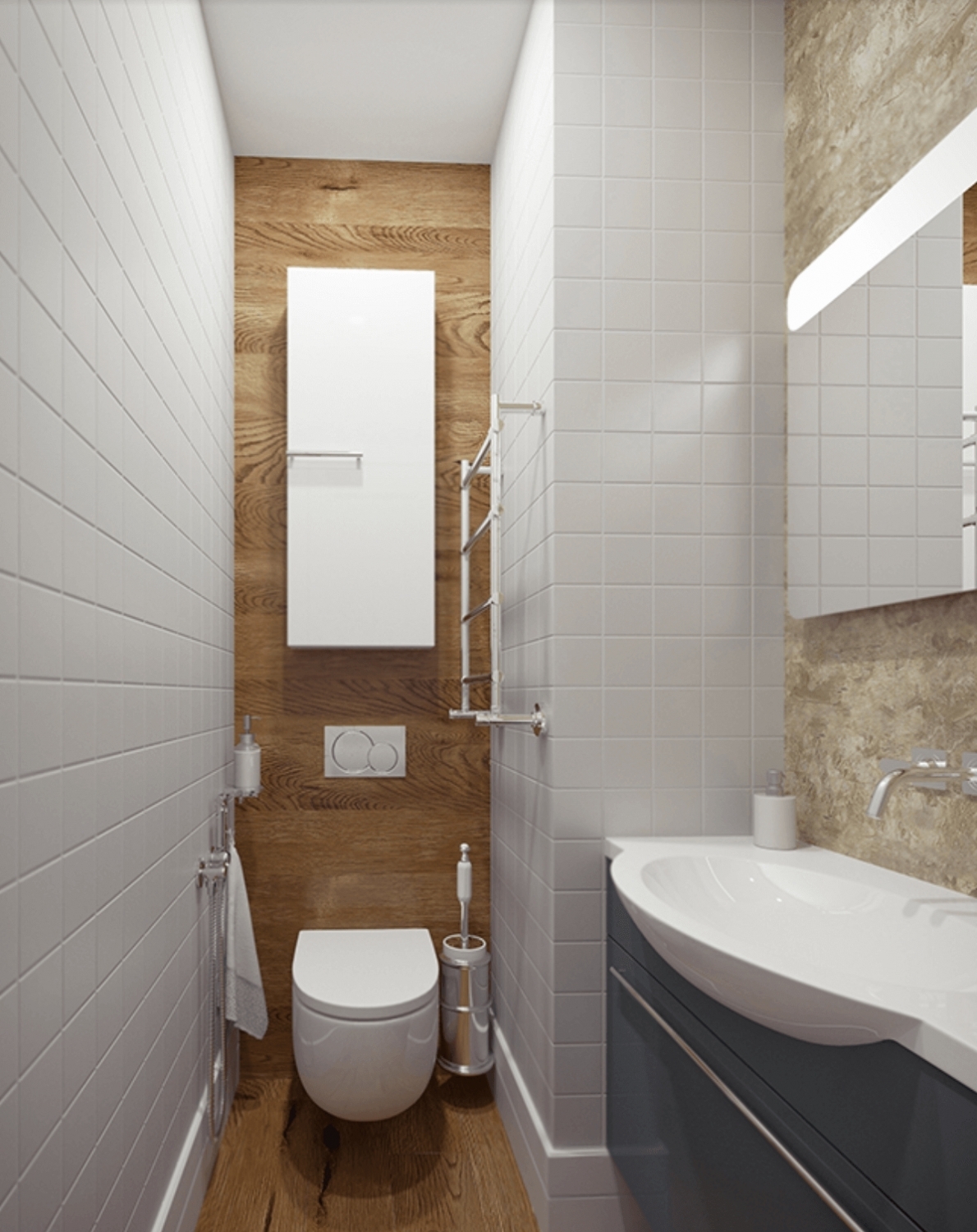 Для дизайна ванной комнаты маленького размера ещё одна идея, если вам почему-то не нравятся такие зеркала, можете приобрести и установить светодиодные фонари вокруг зеркала самостоятельно, и глубина комнаты визуально увеличится.